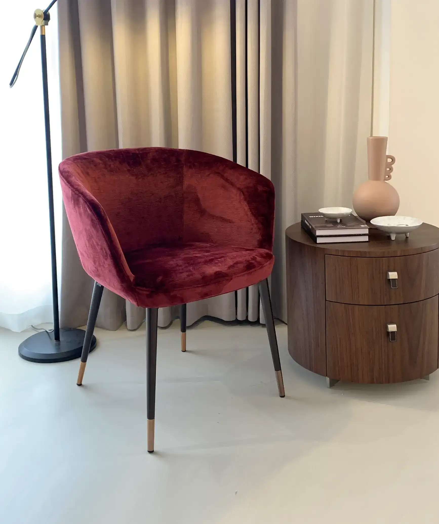 Our luxurious Willow chair, meticulously crafted with soft velvet cloth available in an array of clandestine colours, ensuring a bespoke touch to your interior design. Its distinctive curved back design exudes elegance and charm, while the sturdy metal legs, adorned with golden accents, offer both stability and opulence. Sink into comfort with the plush velvet fabric, guaranteeing a cozy seating experience every time.